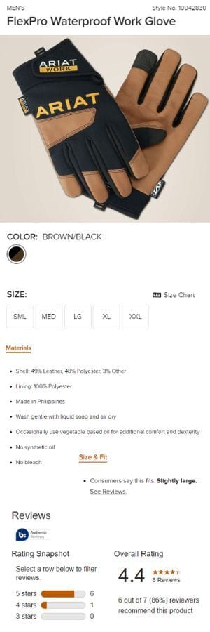 “FlexPro Waterproof Work Glove.” Ariat International, https://www.ariat.com/. Accessed 3 Aug. 2024.